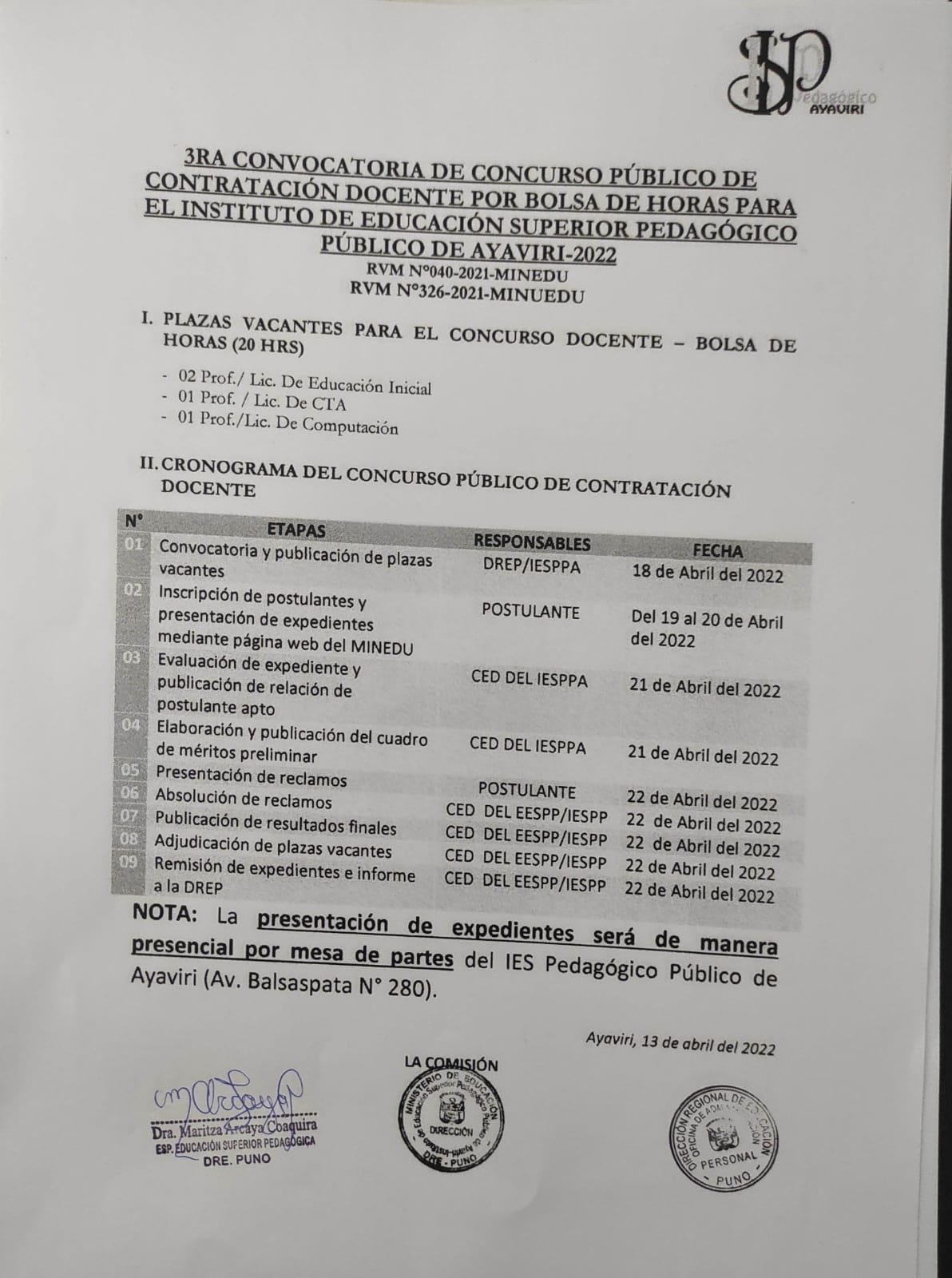 3RA CONVOCATORIA DE CONCURSO PÚBLICO DE CONTRATACIÓN DOCENTE POR BOLSA DE HORAS PARA EL INSTITUTO DE EDUCACIÓN SUPERIOR PEDAGÓGICO PÚBLICO DE AYAVIRI-2022