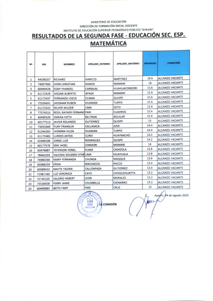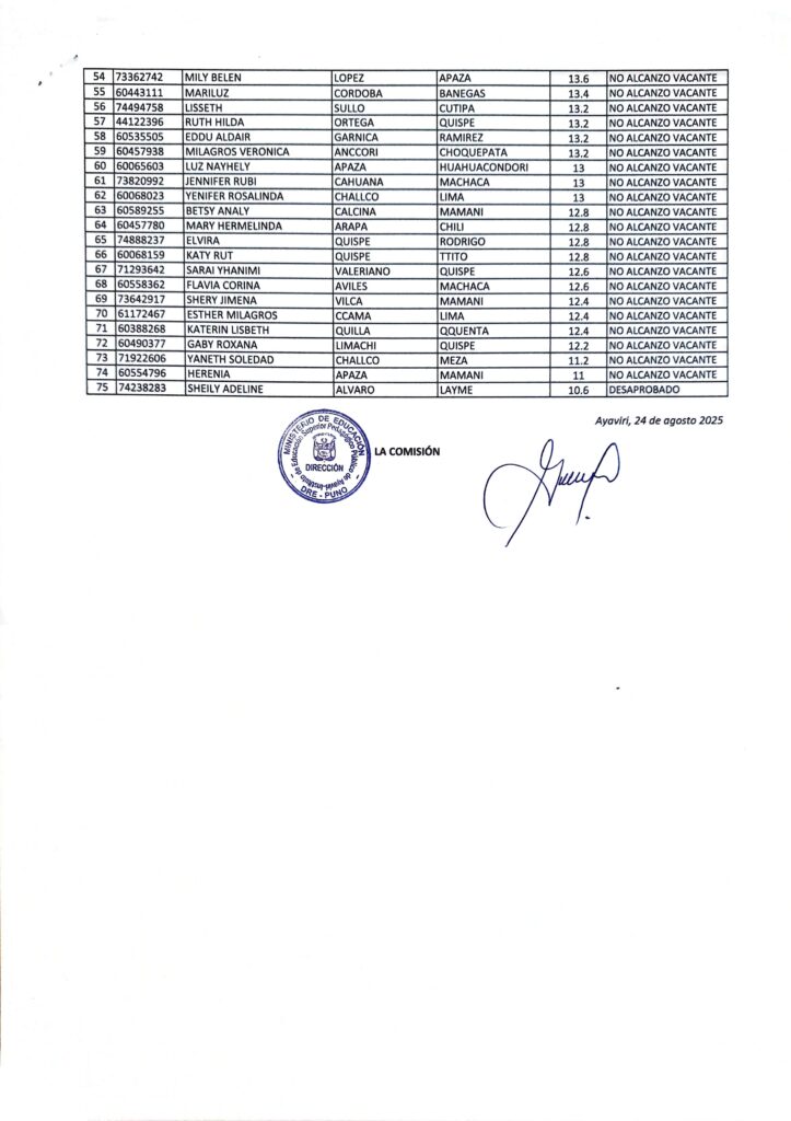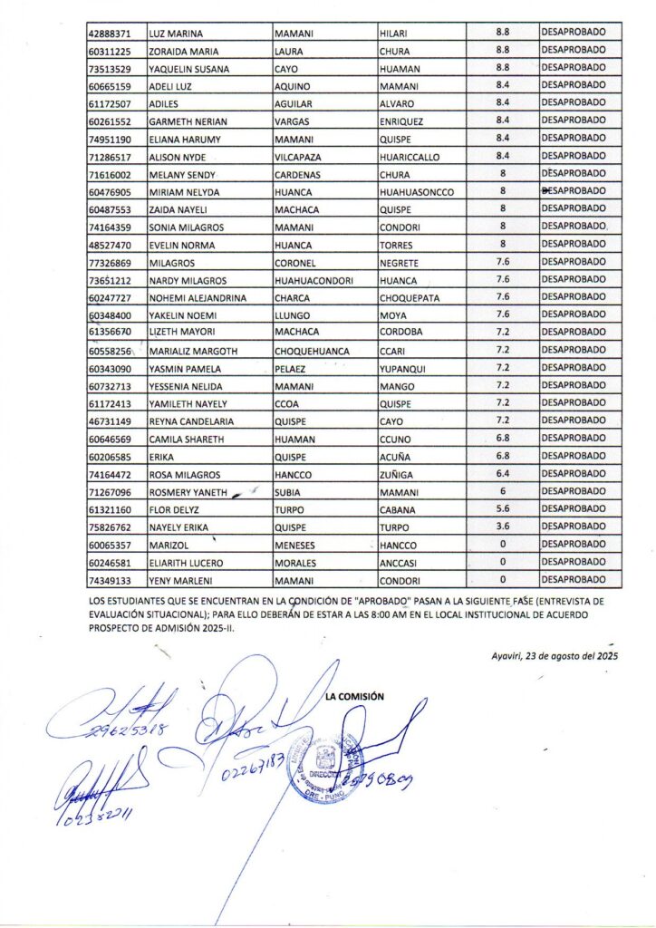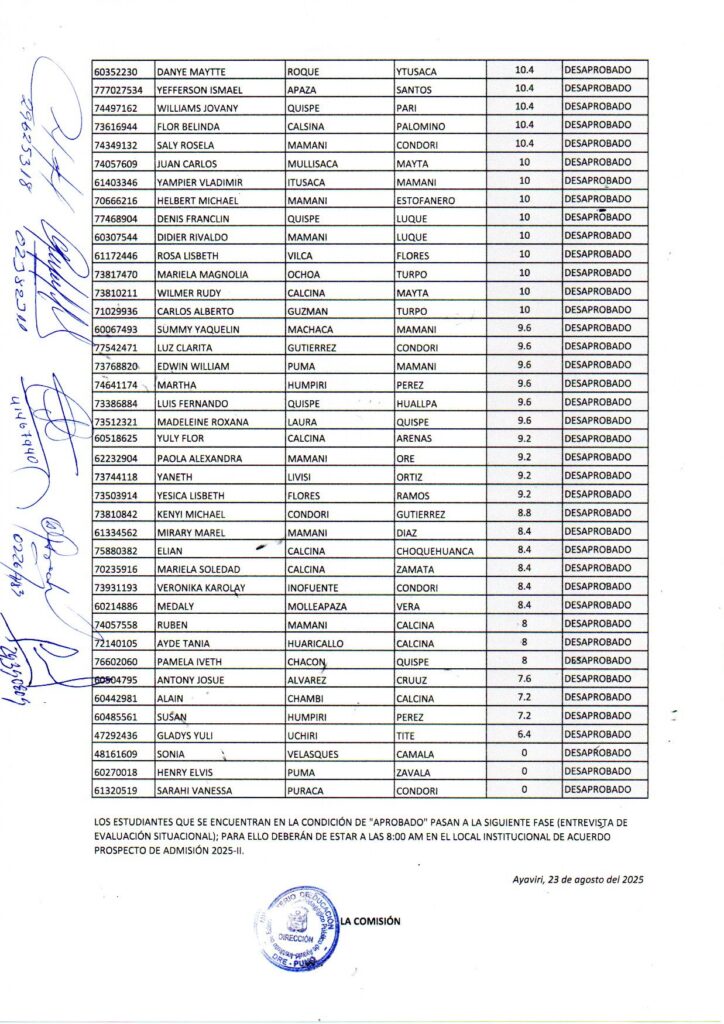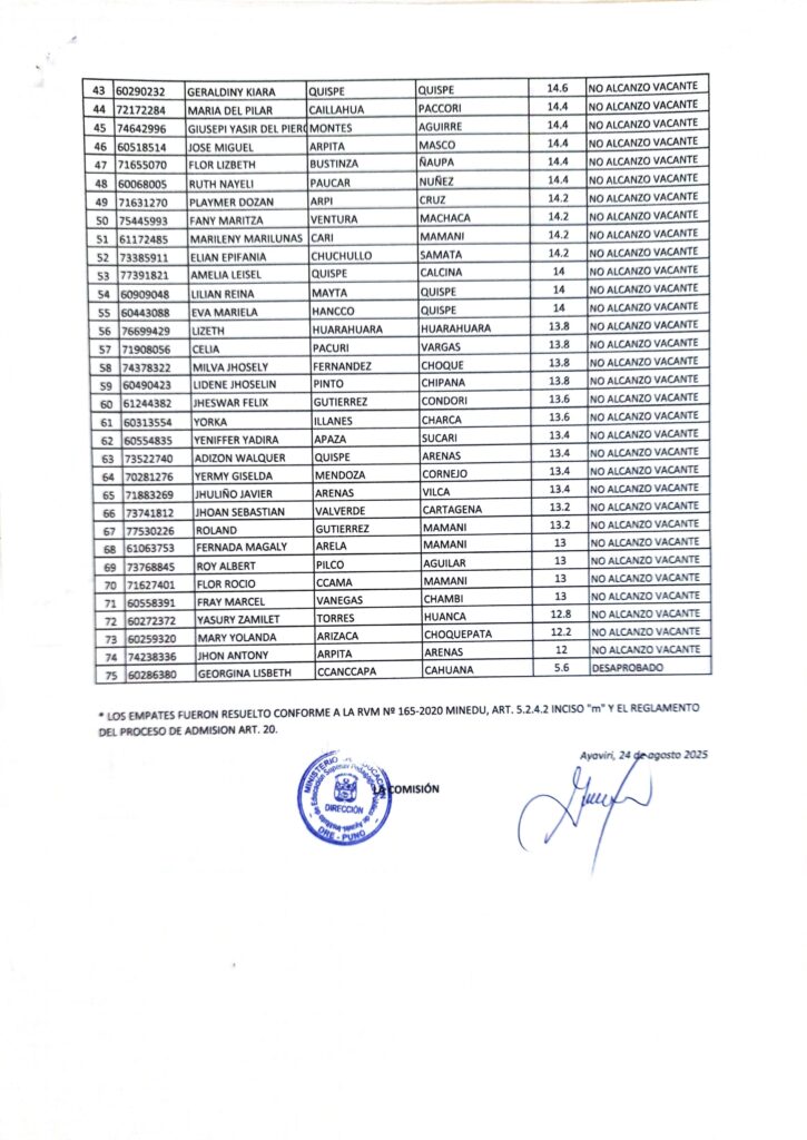 RESULTADOS FINALES DEL PROCESO DE ADMISIÓN 2025-II AL PEDAGÓGICO AYAVIRI