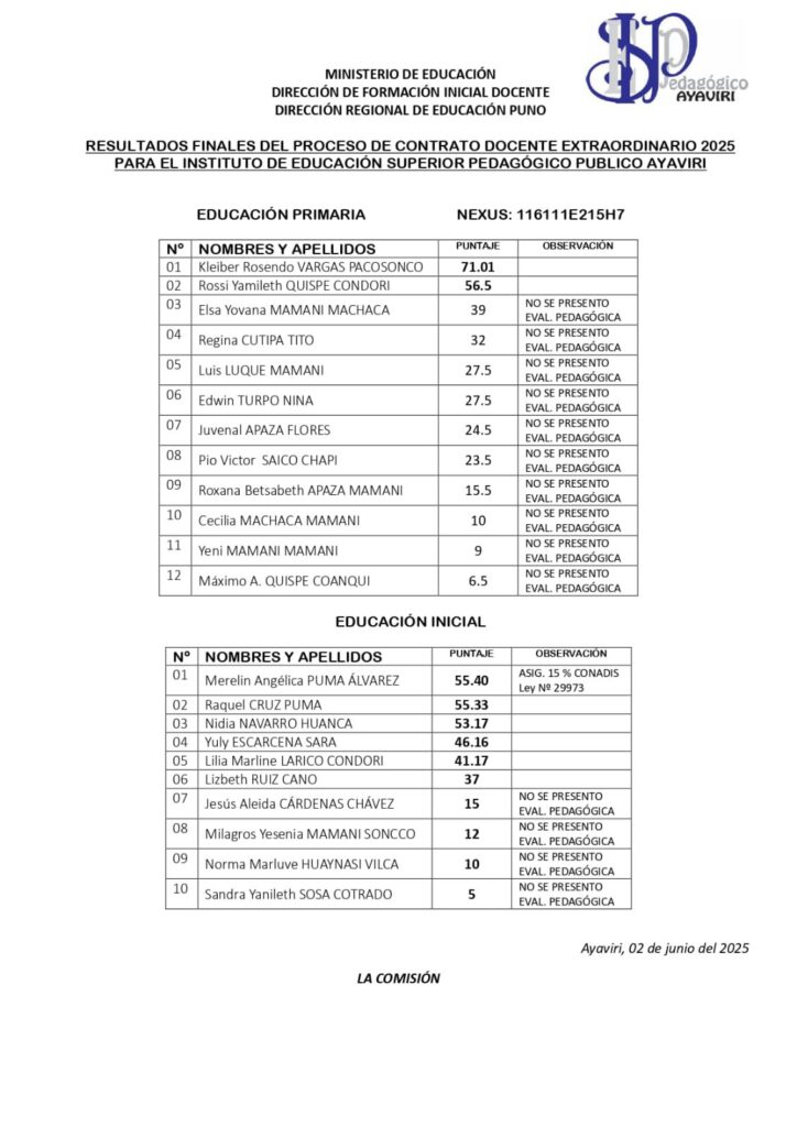 RESULTADOS FINALES DE LA CALIFICACIÓN DEL PROCESO DE CONTRATO EXTRAORDINARIO DOCENTE 2025